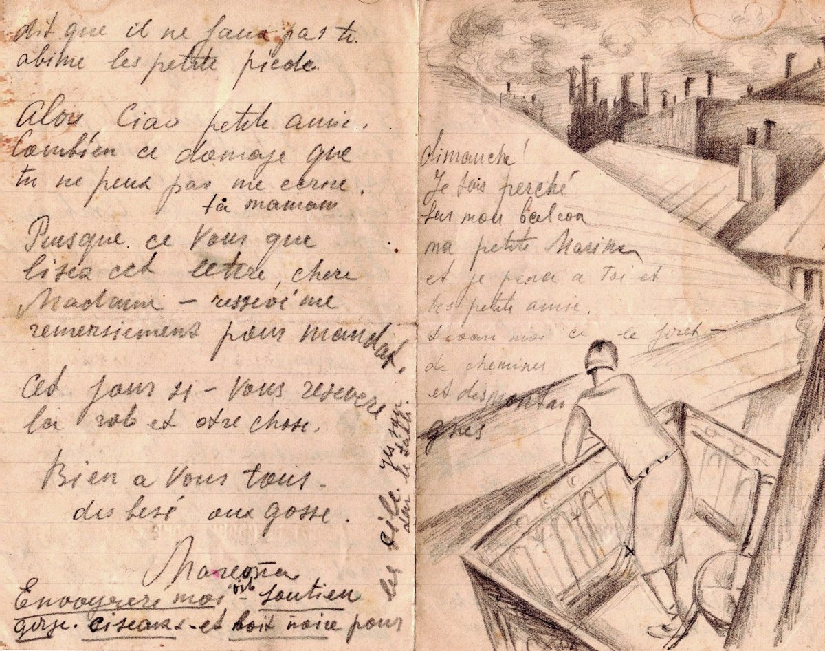 Elle se dessine penchée sur son balcon, regardant les toits de Paris, et commente cette soirée passée au balcon, regardant le spectacle de la rue, admirant le ciel orageux chargé de nuages... Elle fait à sa fille des recommandations (la petite ne sachant pas lire, la lettre sera lue par Mme Germain).