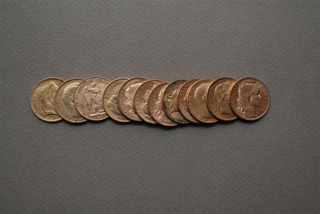 Lot : 12 pièces de 20 F or, Napoléon III (5), Génie (2), coq (5). TTB.