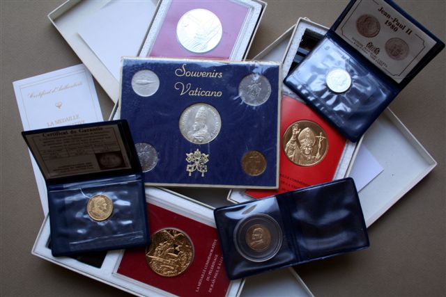 Lot : autour de Jean Paul II et du Vatican, 4 MÉDAILLES dont une en or (6,45g), 1 médaille ar., de Paul VI et 4 monnaies (nk. et cu.) de la cité du Vatican, période de Paul VI.