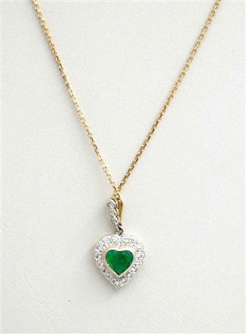 PENDENTIF coeur orné au centre, en serti clos, d'une émeraude de Colombie d'environ 1,20 carats, entourée de 20 diamants taille moderne d'environ 0,70 carat. Et une CHAÎNE en or maille forçat. Poids brut : 7,95 g.