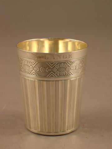 GOBELET en argent à décor de cannelures sur la panse et d'une frise de couronnes de roses dans la partie supérieure. Porte l'inscription " Solange " sur le col.