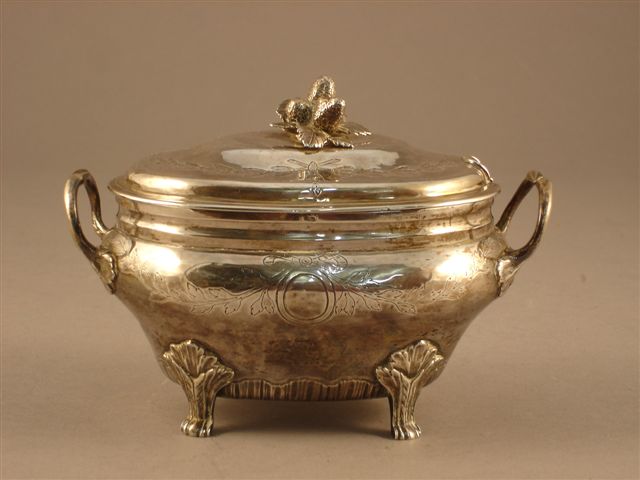 POT À SUCRE en argent. De forme ovale, il repose sur quatre pieds feuillagés terminés en enroulements. La panse renflée dans sa partie supérieure est centrée d'un médaillon flanqué de feuillages. Prises latérales feuillagées et couvercle en doucine, orné d'une frise de lauriers. Le frétel figure trois fraises reposant sur des feuilles.