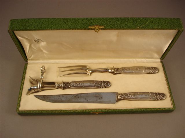 NÉCESSAIRE À DÉCOUPER comprenant un couteau, une fourchette et un manchon. Manches en argent fourré à décor de feuillages, rinceaux et coquilles déchiquetées. Poinçon Minerve. Style Louis XV. Long. 31 cm. pour le couteau. Poids brut 310 g.