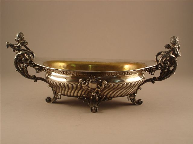JARDINIÈRE en argent. De forme ovale, elle repose sur des pieds feuillagés terminés en enroulements. La panse, renflée dans sa partie supérieure, ornée de godrons torses, est centrée de cartouches sommés de coquillages portés par des putti. Le col évasé, orné de rocailles est souligné par une mouluration feuillagée. Les prises latérales figurent des putti traités en ronde-bosse, portant des roses et soutenus par de larges enroulements ajourés se rattachant à la panse. Doublure de bronze doré.