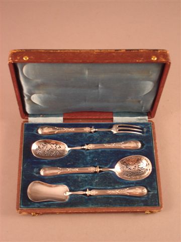 SERVICE À ENTREMETS de 4 pièces en argent comprenant 1 fourchette à trois dents, 1 pelle et 2 cuillers à saupoudrer. Manche monogrammé MG. Poinçon Minerve. Napoléon III. Seconde moitié XIXème siècle. Poids 130 g. Dans un coffret.