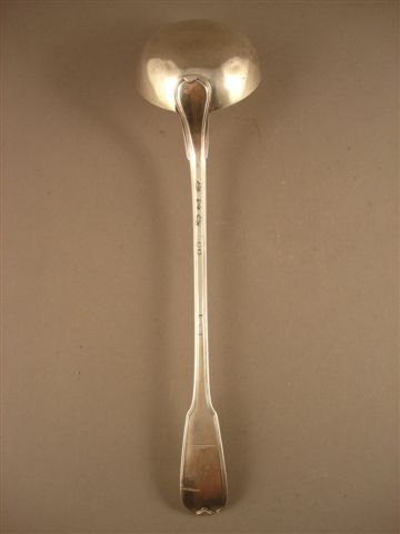 LOUCHE en argent. Modèle à filets. Poinçon de charge pour la ville de Paris entre 1781 et 1789. Poinçon de grosse garantie (Paris,1809-1819). Porte le monogramme LT sur le manche. Poinçon de maître orfèvre indéterminé. Fin XVIIIème siècle - début XIXème siècle. Long. 37 cm. Poids 280 g.