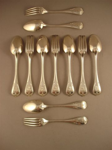 CINQ COUVERTS ET UNE CUILLÈRE en argent. Modèle au filet de forme violonée. Décor ciselé de feuilles d'acanthe. Le manche porte le monogramme SLL. Poinçon Minerve. Style Louis XV. Napoléon III. Milieu XIXème siècle. Poids 935 g.