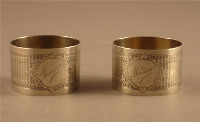 PAIRE DE RONDS DE SERVIETTE en argent ornés d'une double frise tournante de lauriers. Portent l'inscription "Monsieur" et "Madame" dans des cartouches fleuris. Poinçon Minerve. Fin XIXème siècle.