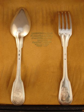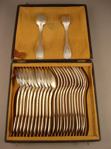 DOUZE COUVERTS en métal argenté. Modèle à filet monogrammé BD.Travail...