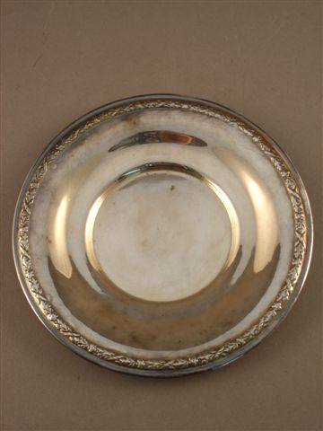 PETIT PLATEAU de forme ronde en métal argenté. L'aile en doucine ornée d'une frise de feuilles de chêne fleurie et enrubannée.