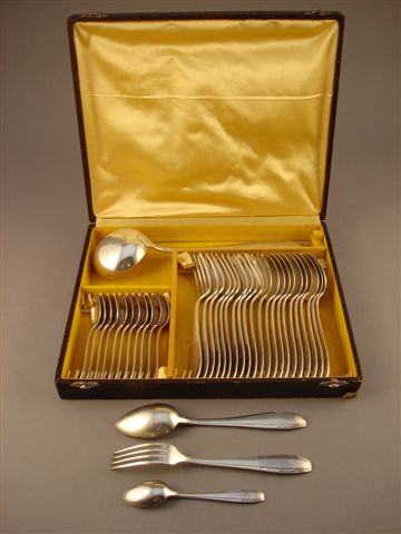 MÉNAGÈRE de 36 pièces en métal argenté comprenant onze couverts, une cuillère, douze cuillères à café et une louche. Décor de motifs géométriques.