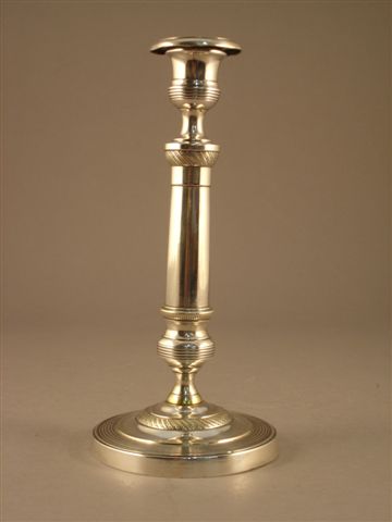 FLAMBEAU en métal argenté, à moulures de filets et frise tournante de perles. Le pied rond à contours et gorge en doucine, l'ombilic à décor de filets et godrons, surmonté du fût cylindrique et du binet à bague filetée dans sa partie inférieure.