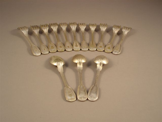 PARTIE DE MÉNAGÈRE de 15 pièces en métal argenté. Modèle au filet. Elle comprend quatre cuillères et onze fourchettes. Seconde moitié XIXème siècle.