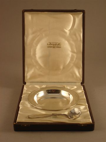 ASSIETTE À BOUILLIE ET CUILLÈRE DE BAPTÊME en métal argenté. XXème siècle.