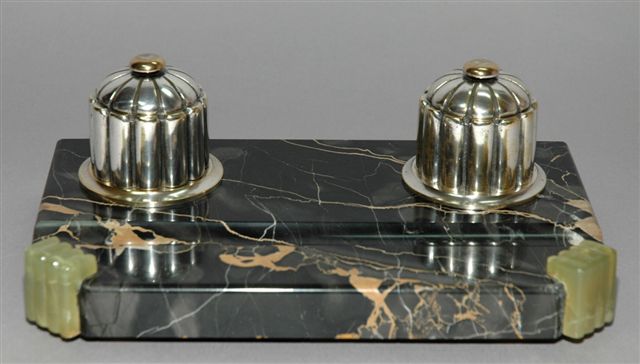 ÉCRITOIRE Art Déco, sur une base en marbre noir veiné beige, deux portes godets encriers en BRONZE argenté à décor godronné, pour godets encriers en cristal, sous couvercle charnière. Deux angles ont des incrustations en onyx.