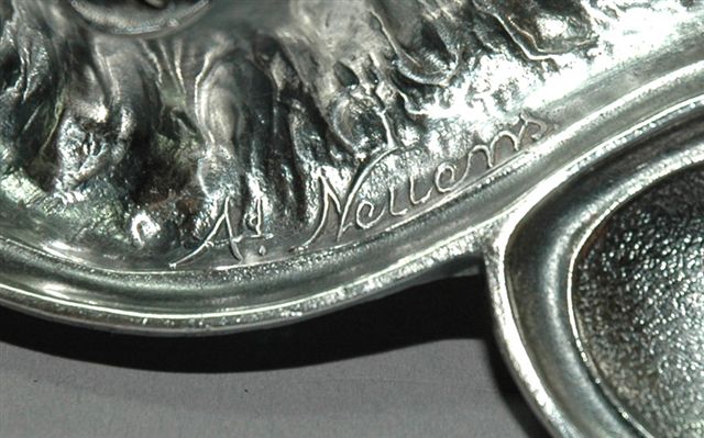 ÉCRITOIRE en ÉTAIN, Art Nouveau, forme plateau avec réceptacles plumiers pour un décor animalier d'un lion couché. La tête dissimule un premier encrier, un second encrier se trouve dans le tronc d'arbre. Signature du sculpteur : ADT. NEUENS
