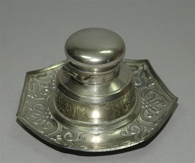 ENCRIER en ÉTAIN, Art Déco forme flacon sur plateau à sept côtés. Décor d'arabesques sur le plateau. Le godet encrier est fermé par un bouchon charnière.