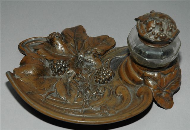 ÉCRITIORE en RÉGULE, Art Nouveau, base en coupelle feuillagée pampre de vigne et raisin portant un godet encrier en flacon cristal à bouchon charnière en régule à patine brune.
