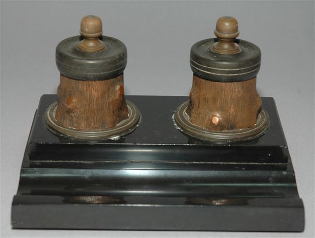 ÉCRITOIRE époque N III, à deux troncs d'arbres en RÉGULE à patine cuivrée rouge pour deux godets encriers sous couvercle charnière en ébène. Sur une terrasse étagée en marbre noir avec rainure plumier. Circa fin XIXème.