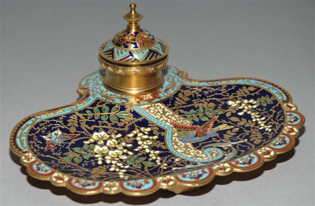 ENCRIER en ÉMAUX CLOISONNÉS (champlevé) à décor japonisant d'oiseau et de fleurs. Pour un godet encrier à couvercle charnière sur le plateau plumier ovoïde à bords festonnés. deux godets encriers.