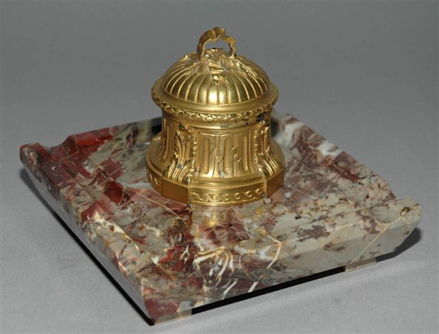 ENCRIER cylindrique N III en BRONZE DORÉ sur une base carrée en marbre rouge royal. Au centre le godet encrier est sous couvercle charnière godronné à prise ruban.