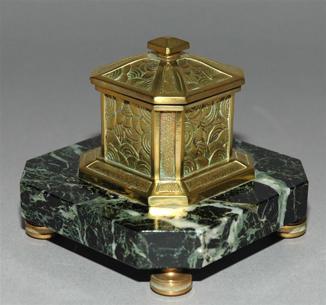 ENCRIER Art Déco en BRONZE DORÉ sur une base carré à coins coupés en marbre campan vert. Au centre le godet encrier cubique à décor floral sous couvercle charnière.
