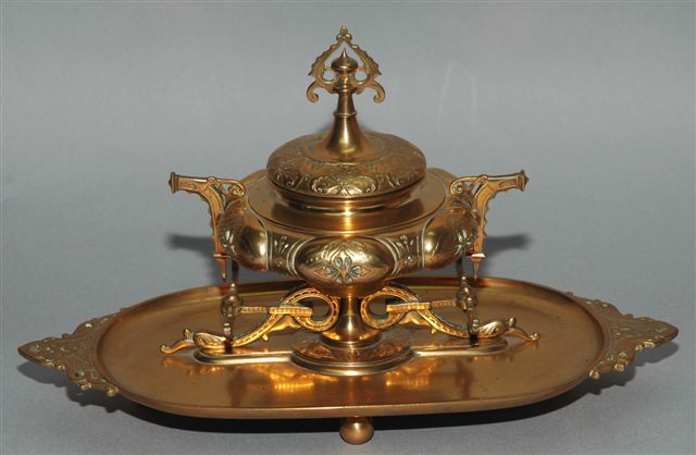 ENCRIER en BRONZE DORÉ style orientaliste d'une urne forme calice fermée par un couvercle charnière à deux prises latérales et double griffes repose plume fixée au centre d'un plateau plumier ovale à deux prises latérales. Pièce marquée H P sous le piedouche et nom illisible sous le plateau.