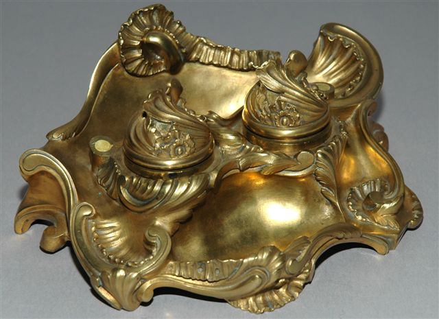 ÉCRITOIRE en BRONZE DORÉ à la feuille forme rocaille style Louis XIV avec des motifs de coquilles, volutes et feuilles d'acanthe et rubans finement ciselés d'après modèle d'HENRI DASSON. Il présente deux porte- godets encriers fermés par couvercles charnière et des réceptacles à plume ou autres accessoires, circa 1870 - 1880.