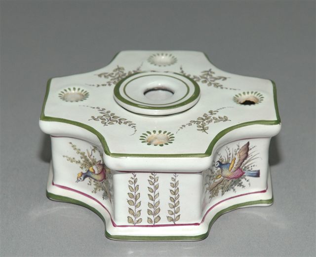 ENCRIER forme croix à décor faune (faisans) et floral pour un godet encrier et quatre trous pique plume, les liserés sont surlignés d'un filet vert. (égrenure au godet et petit défaut de cuisson).