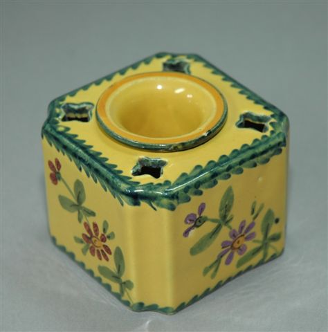 ENCRIER cubique aux angles concaves pour un godet encrier et quatre trous pique plume. Décors jaune à fleurs et liseré vert, (bouchon absent).