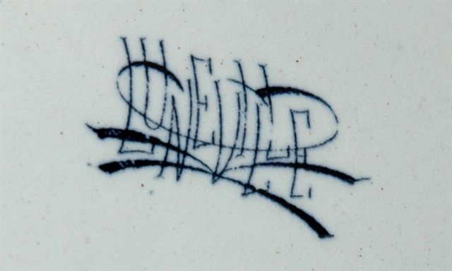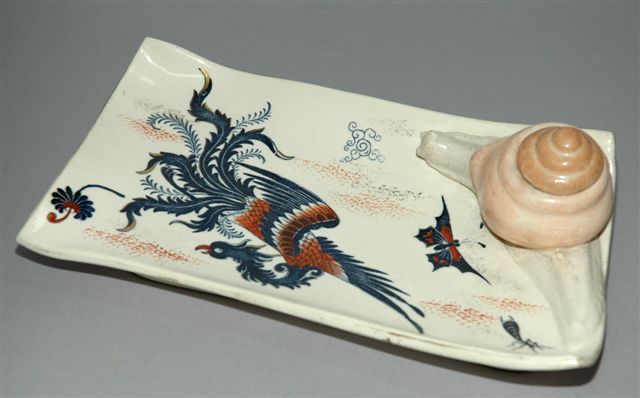 ENCRIER plateau style parchemin avec un godet dans coquille d'un escargot. Décor d'un oiseau de paradis et insectes. Marque en lettres cursives : LUNEVILLE dans les initiales K G, circa 1890.