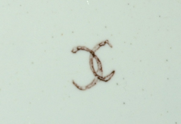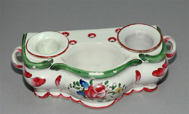 ÉCRITOIRE XVIIIème en forme de commode galbée avec deux petites prises latérales à décor floral de roses mousses dans des coloris vert et pourpre. La partie supérieure porte deux godets encriers et cinq trous pique plume. (égrenures et un godet refait). Manufacture de NIEDERVILLER, deux C inversés entrelacés pour la période Comte de CUSTINE.