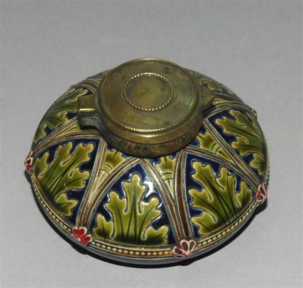 ENCRIER lentille presse papiers en barbotine à décor de feuille d'acanthe dans sept ogives de style gothique. La fermeture est assurée par un couvercle charnière laiton. Il porte des chiffres : 1185 puis 332 B, attribué à SARREGUEMINES.