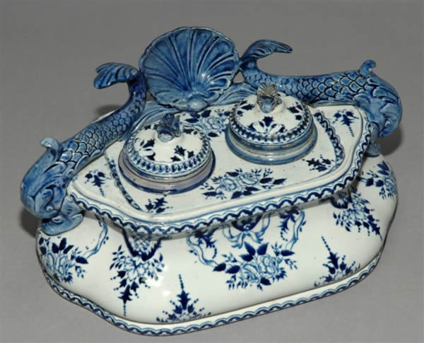 ÉCRITOIRE Dauphins pour deux godets encriers couverts, décor Rouen monochrome n°7.