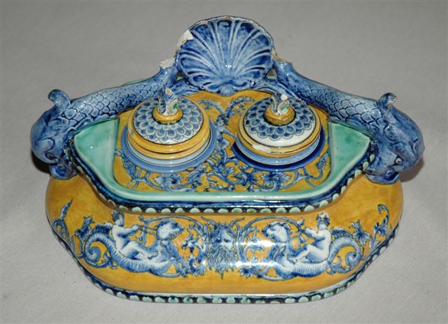 ÉCRITOIRE Dauphins pour deux godets encriers couverts, décor italien n° 28 sur fond jaune.