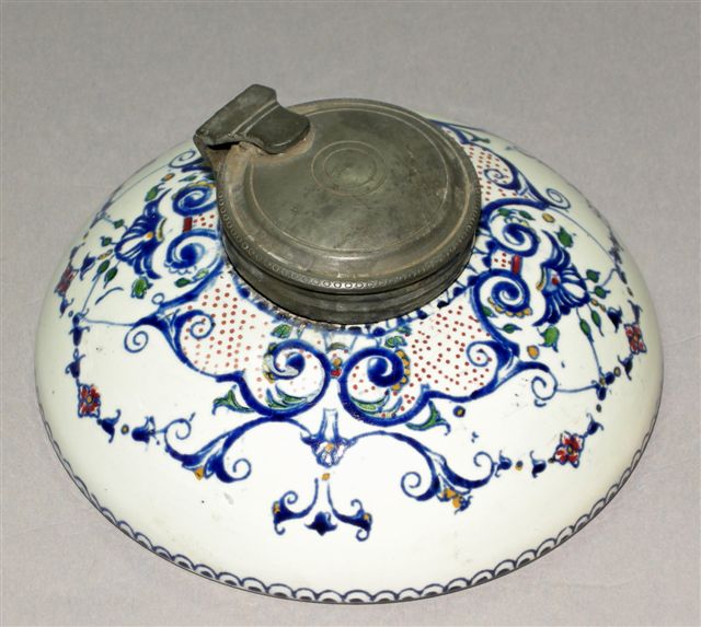 ENCRIER lentille presse-papiers à couvercle bascule en étain, décor Rouen.
