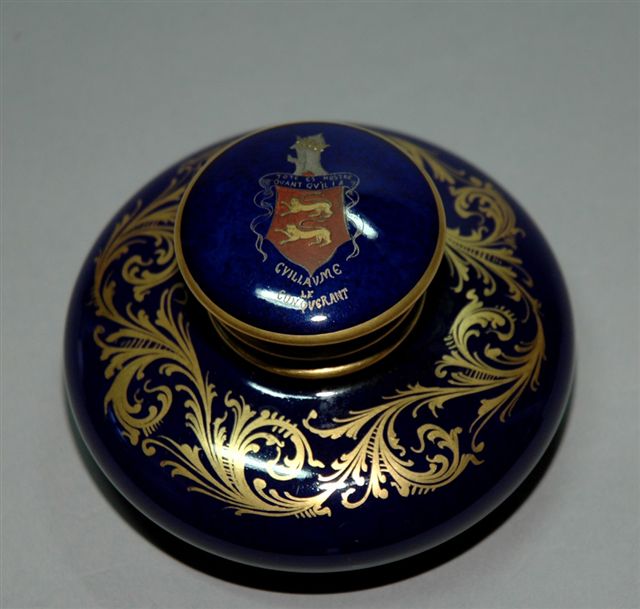 ENCRIER flacon forme lentille pour un godet encrier couvert. Le décor en bleu de Tours et rehauts or, aux motifs des armes de Guillaume le Conquérant.