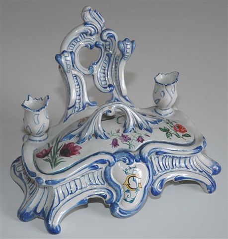 ÉCRITOIRE forme boîte avec un dosseret porte montre et deux binets à chandelle. Sous le couvercle à décor de fleurs et prise de feuilles d'acanthe, la boîte recèle deux godets encriers à liseré bleu de part et d'autre d'un réceptacle de rangement. La base, les pieds et le dosseret sont de formes mouvementées aux liserés souligné de bleu. Au centre de la face avant dans une réserve écussonnée revient le monogramme FG.