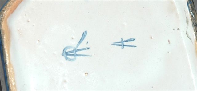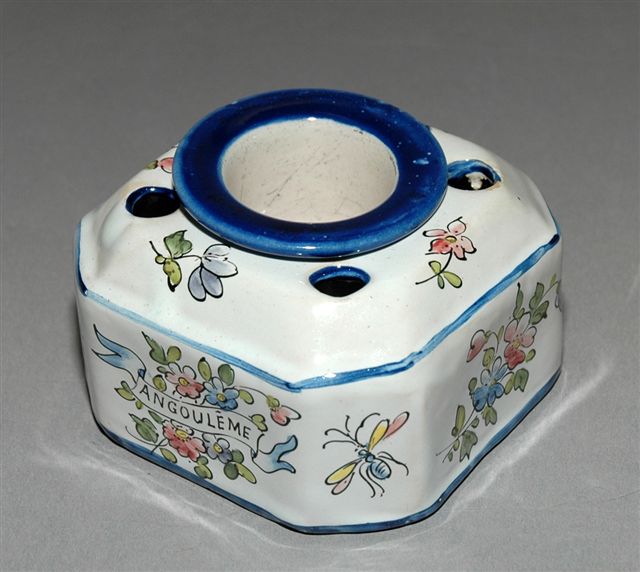 ENCRIER forme carré à coins coupés à décor de fleurettes et insectes et à liseré peint bleu, pour un godet encrier encadré de quatre trous pique plume.
