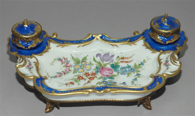 ÉCRITOIRE style louis XV en plateau plumier chantourné sur piètement en laiton patiné bronze, pour deux godets encriers avec bouchons à cerclage laiton et fermoirs papillon. Un décor au bouquet et rehauts de liserés or sur couverte blanc et bleue.