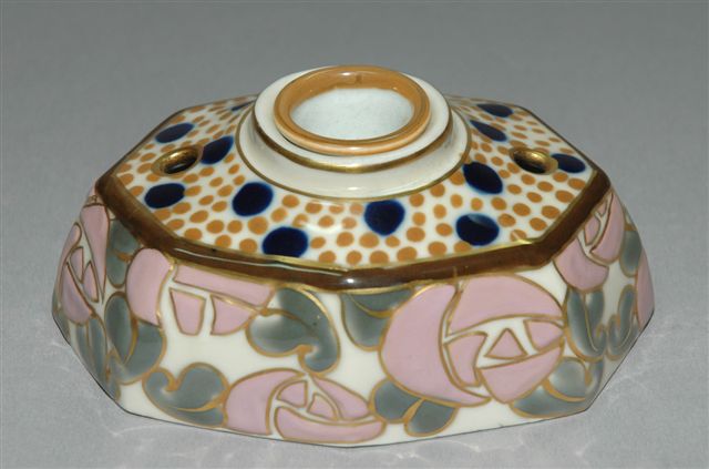 ENCRIER en porcelaine forme octogonale ovoïde pour un godet encrier et deux trous pique plume. Un décor aux émaux en reliefs de fleurs stylisées.