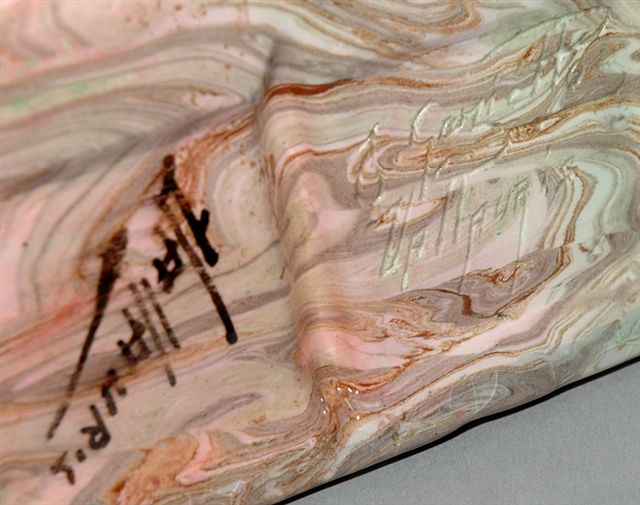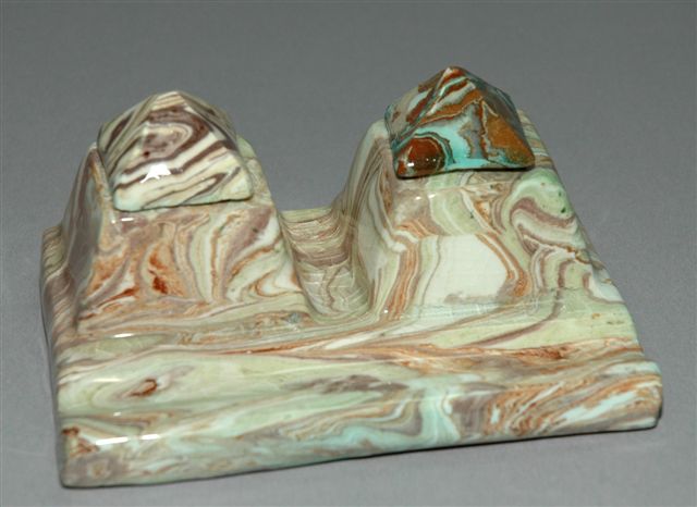 ENCRIER forme de deux pyramides tronquées à bouchons pyramidions sur base rectangulaire portant rainure repose plume. Décor typique des terres mêlées avec veinage ocre rouge et vert. Coloration due à l'encre, visible sur un bouchon.