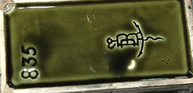 ENCRIER forme boîte rectangulaire portant un godet encrier et un godet poudreur sur la partie supérieure. Le décor est à motif floral or rehaussé de petits émaux bleu et blanc, sur une couverte vert foncé.