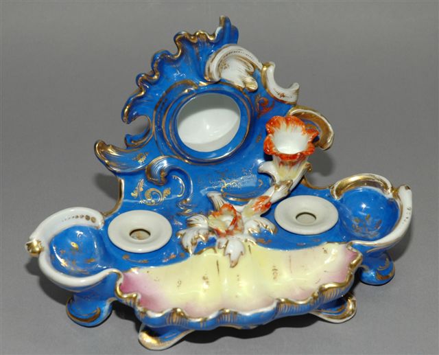 ÉCRITOIRE porte montre en porcelaine de PARIS, forme rocaille avec palmettes et coquilles dont une à fonction de plumier. Elle offre deux godets encriers et la plus gosse fleur du décor fait office de binet. Le décor polychrome style Charles X a dominante bleue rehaussé de motifs et filets or.