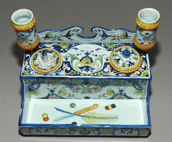 ÉCRITOIRE en faïence de forme cassette reposant sur quatre pieds dont la base fait fonction de plumier. La terrasse porte deux godets dont un encrier avec son bouchon et un poudreur et, aux angles du dosseret deux binets. Elle est à décor de Rouen polychrome sur toutes les faces et sur le fond du plumier sont représentés une plume d'oie et un canivet.