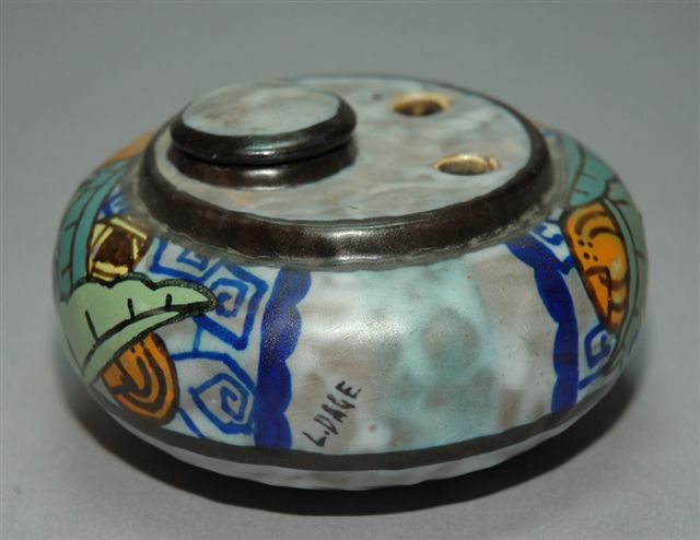 ENCRIER Art Déco en grès, forme d'une bonbonnière cylindrique ventrue pour un godet encrier excentré, avec son bouchon et deux trous pique plume. Le décor typique de ce céramiste présente le fond nuagé et motifs floraux stylisés.
