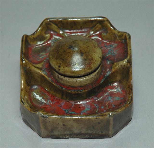 ENCRIER en grès, à gradin forme octogonale pour un godet encrier centré, avec son bouchon et rainures repose plume. Le décor est typique par l'émaillage particulier de ce céramiste avec son célèbre coloris sang de buf. (manque le godet et émaillage légèrement craquelé).