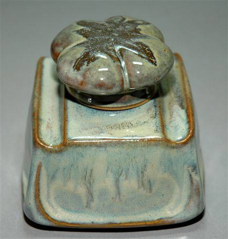 ENCRIER Art Nouveau en grès, forme cubique (modèle n° 257 du catalogue de 1930) pour un godet encrier centré, avec bouchon quadrilobé d'évocation florale. Le décor est à émaillage irisé à coulure dans les tons vert et ocre.