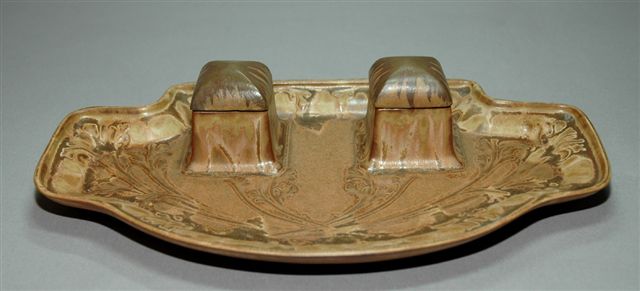 ENCRIER plumier Art Nouveau en grès, forme plateau ovoïde polylobé avec deux portes godets avec bouchons en recul du plumier (modèle n° 188 du catalogue de 1930) pour deux godets encriers en grès. Le décor floral est à émaillage dans les tons ocre et brun.