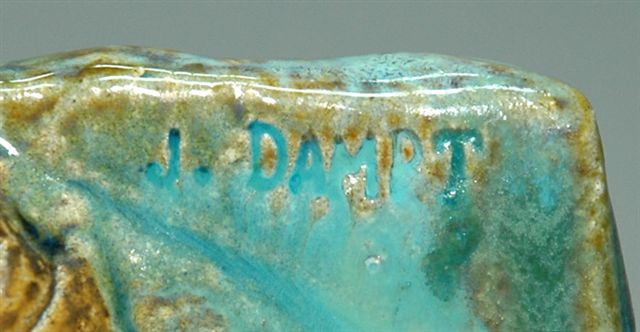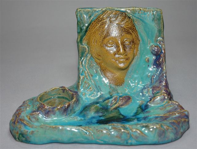 ENCRIER Art Nouveau en grès sur le thème de la femme. Le plateau de forme ovoïde à bords irréguliers fait fonction de plumier et reçoit un godet encrier. A son côté un dosseret pyramidal décoré en bas relief d'un visage de jeune femme dû au sculpteur J. DAMPT dont la signature figure en creux dans le coin droit au-dessus du visage. L'émaillage est dans des tons ocre, bleu, vert et violine.